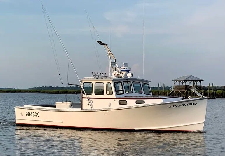Sitting in Edisto Island is a legendary Mitchell Cove 32, a hull drawn by Calvin Beal Jr. known for being a tank in a head sea. This isn’t a picnic boat; it’s a weapon. It comes rigged with a pot hauler, a gin pole for hauling monster tuna (or swords), and a 300HP Caterpillar diesel that cruises at a respectable 13 knots.